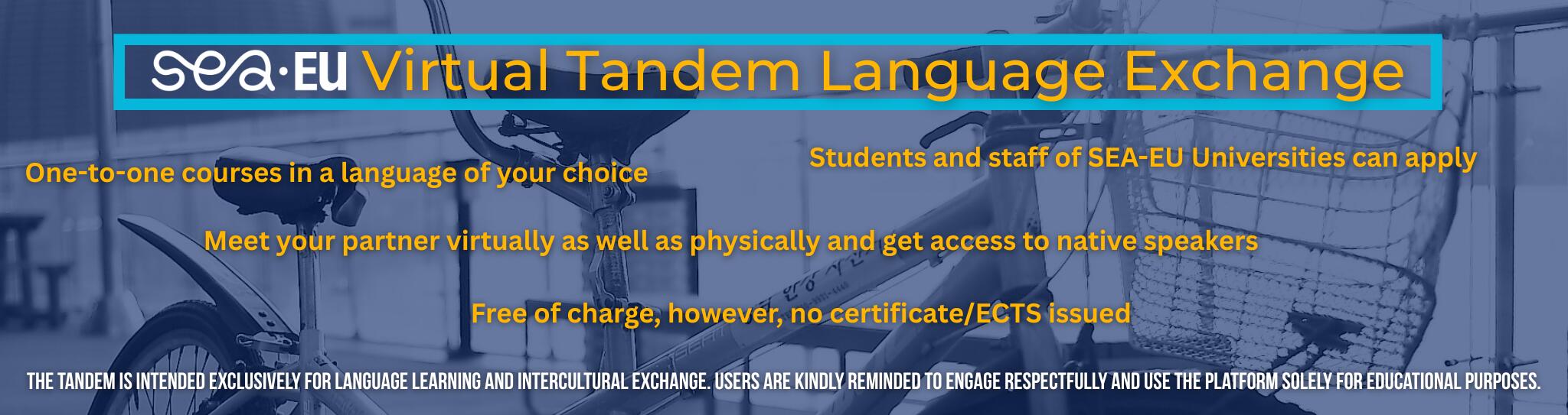 As a member of the SEA-EU alliance unversities are you interested in a language tandem? Then (1) register as a user with your university email (a must!) and (2) enroll in SEA-EU Virtual Tandem Language Exchange (VTLE) Virtueller Tandem-Sprach-Austausch. The tandem programme is available all year round.